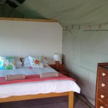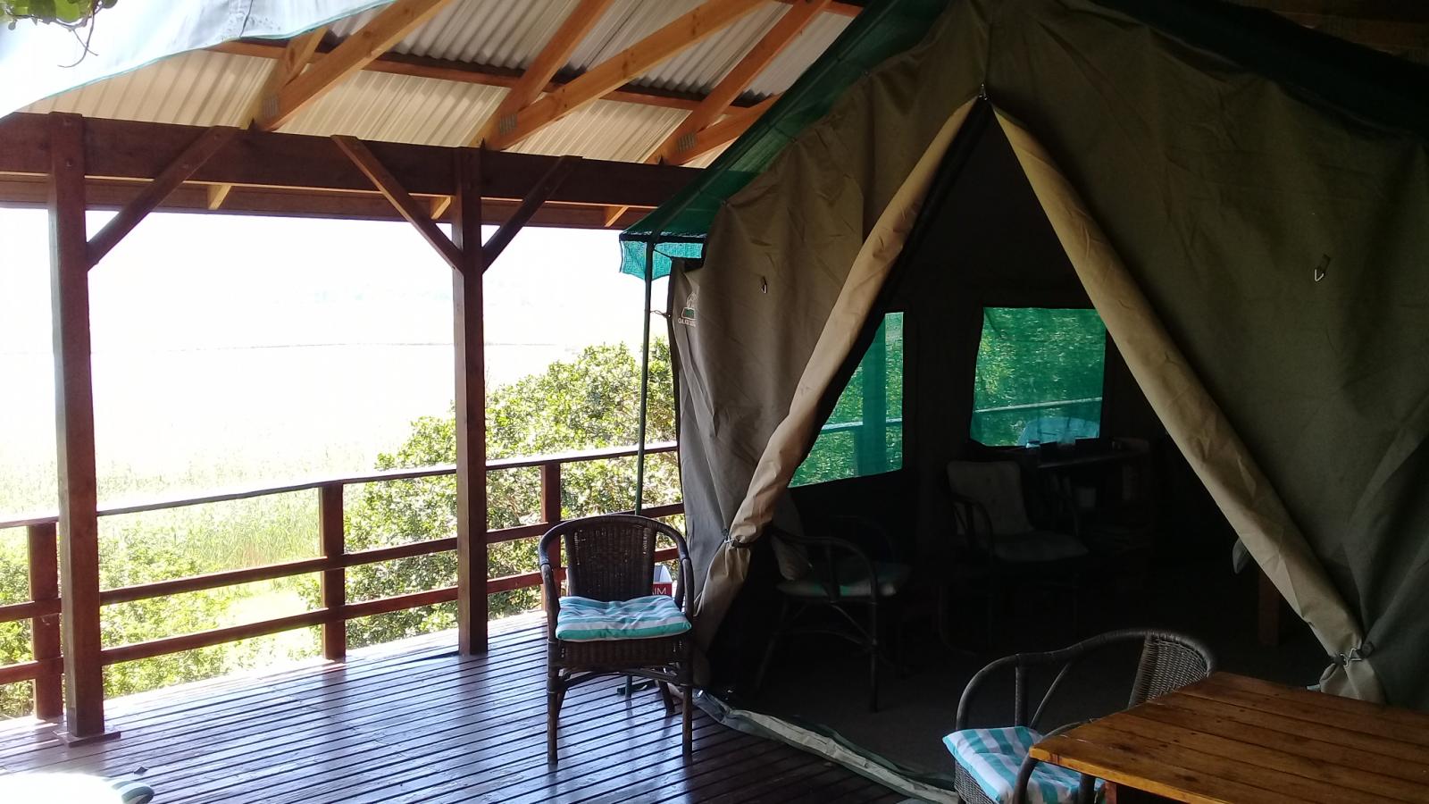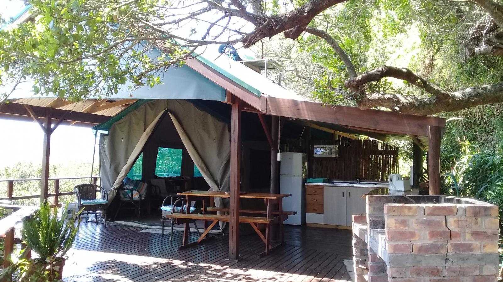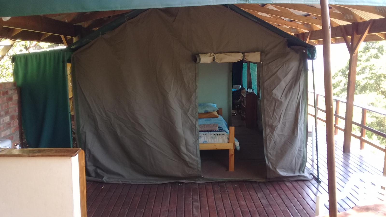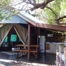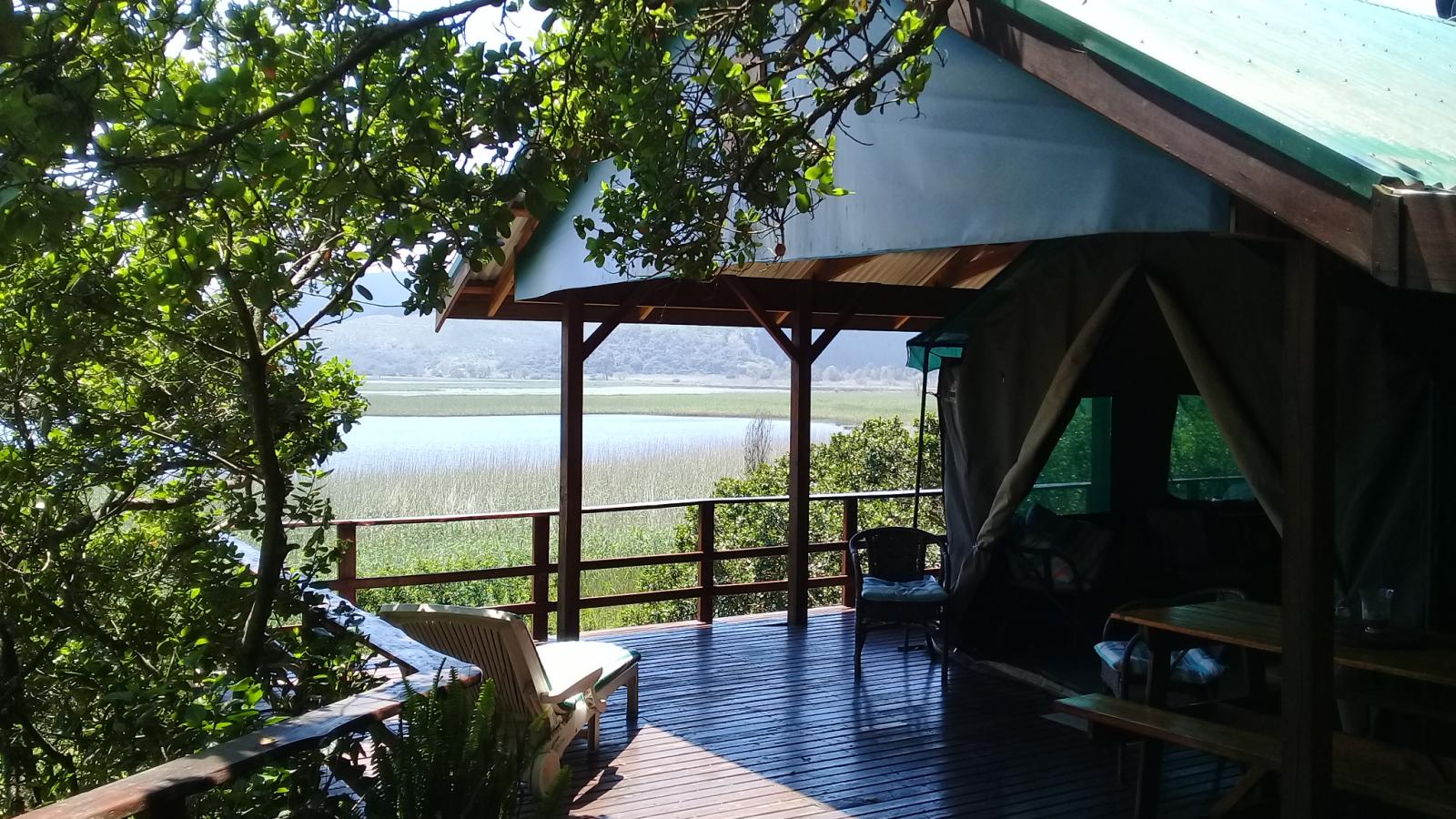 Experience tranquility and privacy in nature on the Garden Route. A nature lover's retreat with birds and bushbuck coming down to the waters edge to drink. Nestled in amongst the milkwood trees the bushtent sleeps a maximum of 4 people, and comprises of a main room with a double bed and a smaller room with 2 single beds. It has adjoining toilet and shower facilities and a fully equipped kitchen. An outside braai /barbeque area on the deck is also right next to the kitchen.