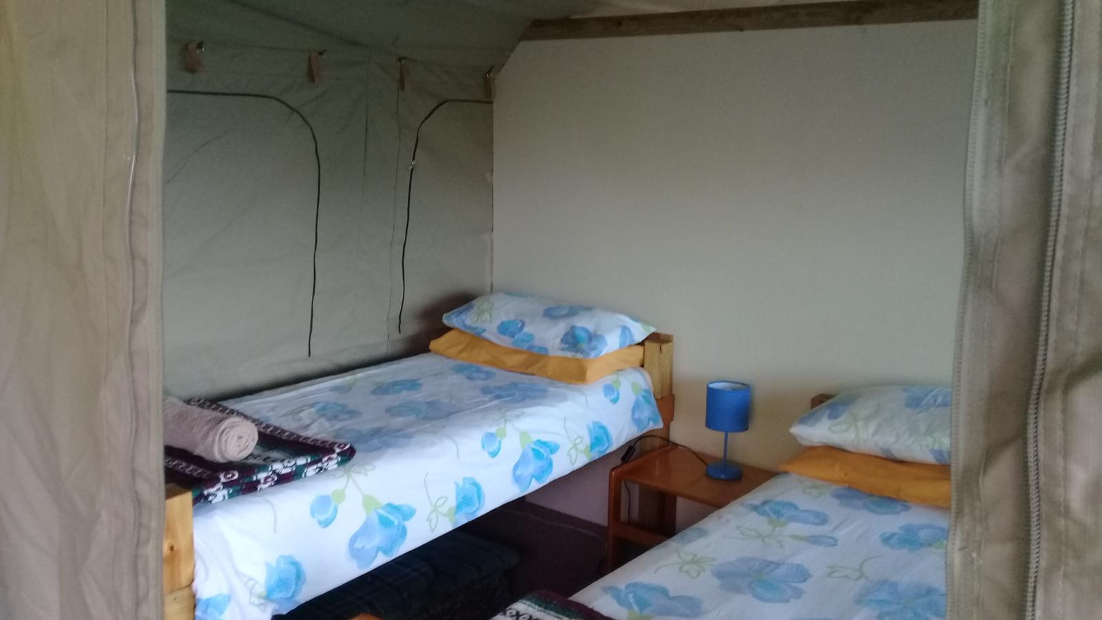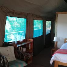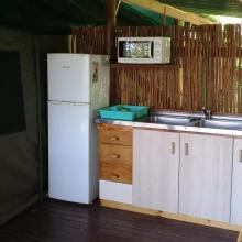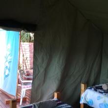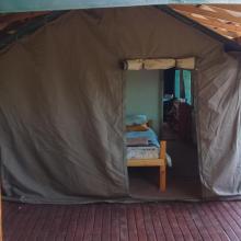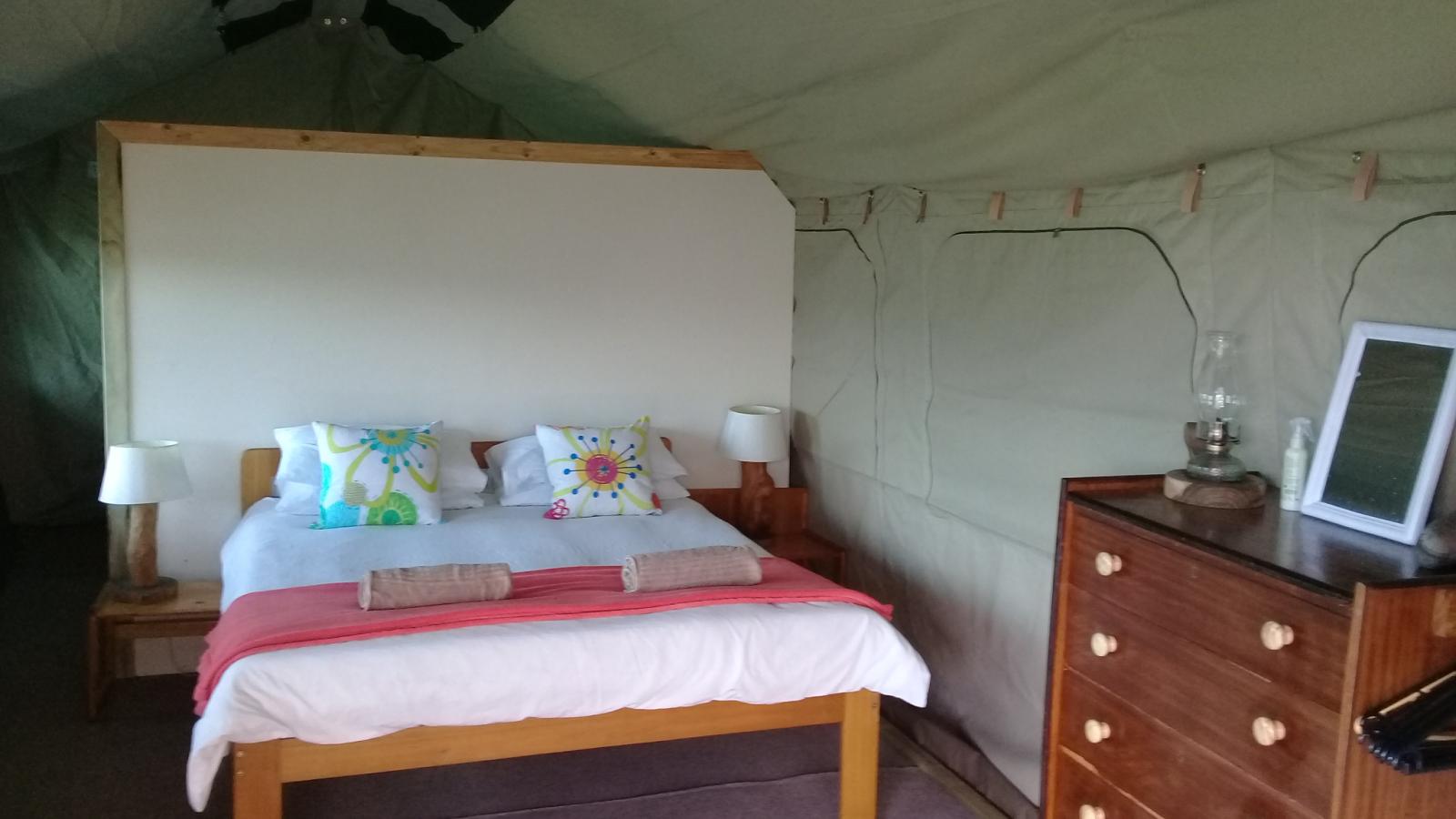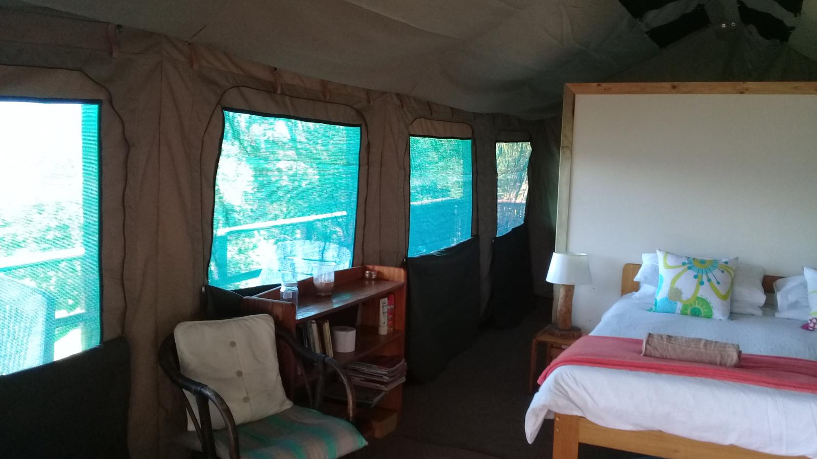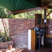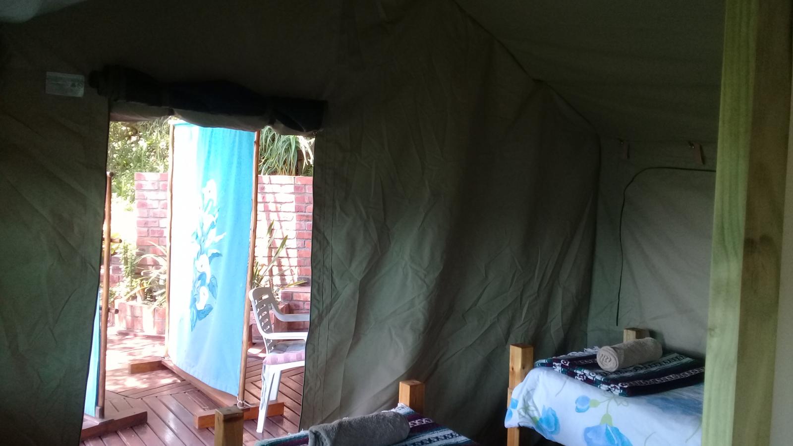 Experience tranquility and privacy in nature on the Garden Route. A nature lover's retreat with birds and bushbuck coming down to the waters edge to drink. Nestled in amongst the milkwood trees the bushtent sleeps a maximum of 4 people, and comprises of a main room with a double bed and a smaller room with 2 single beds. It has adjoining toilet and shower facilities and a fully equipped kitchen. An outside braai /barbeque area on the deck is also right next to the kitchen.