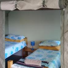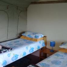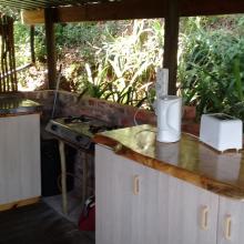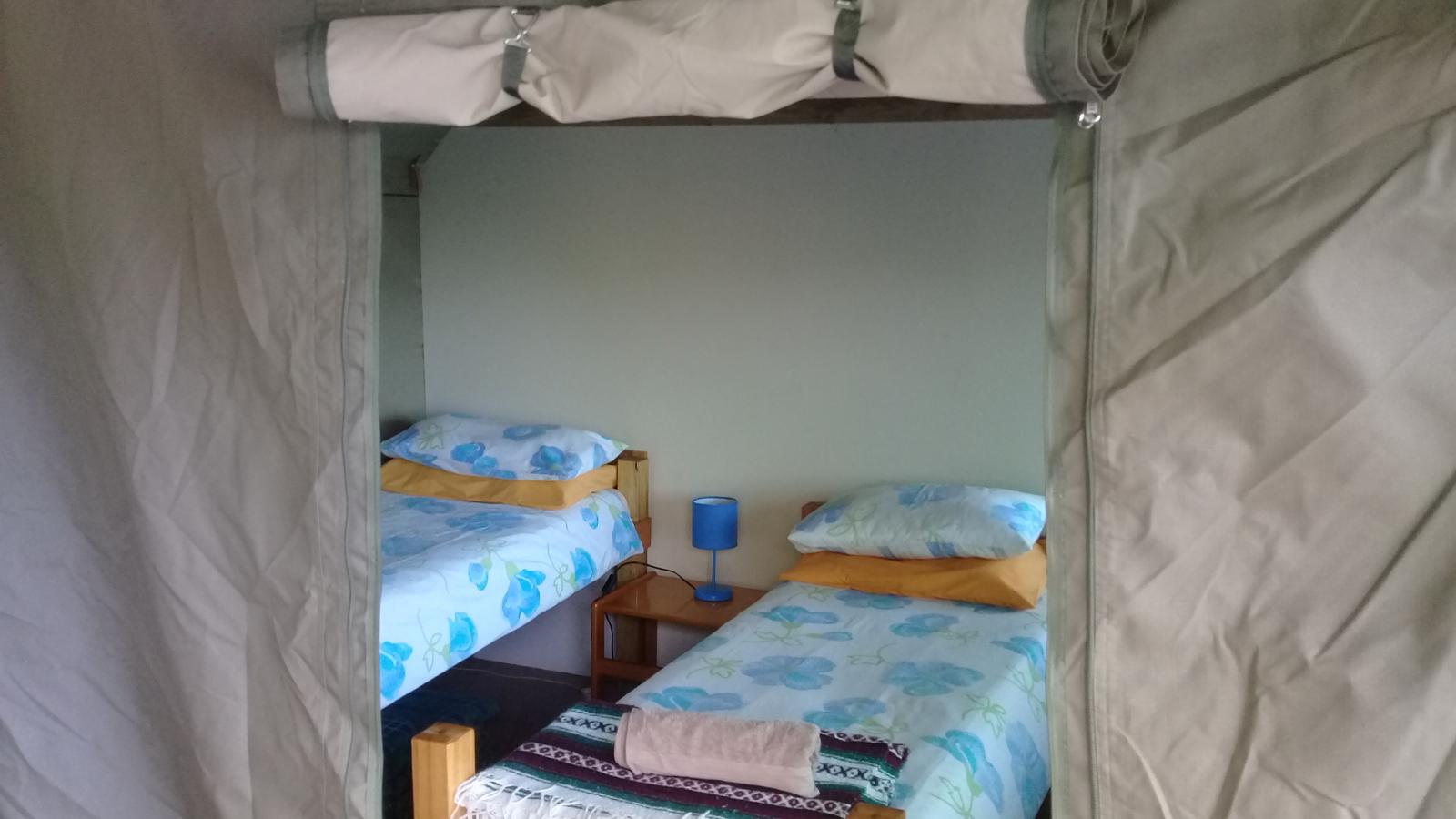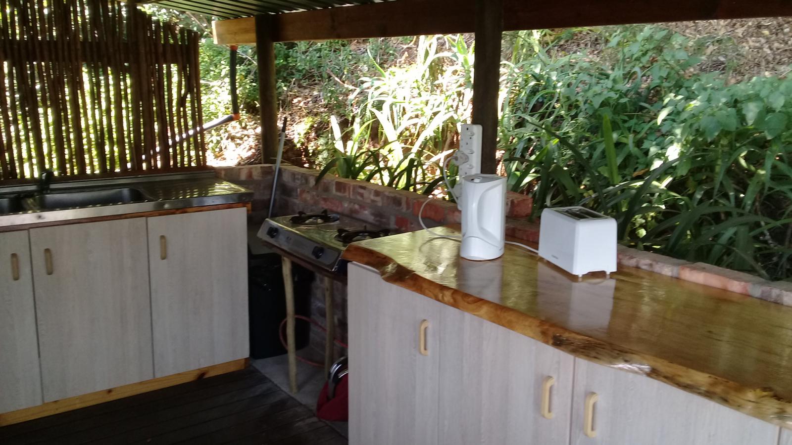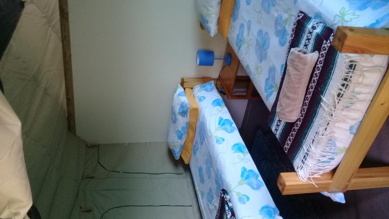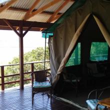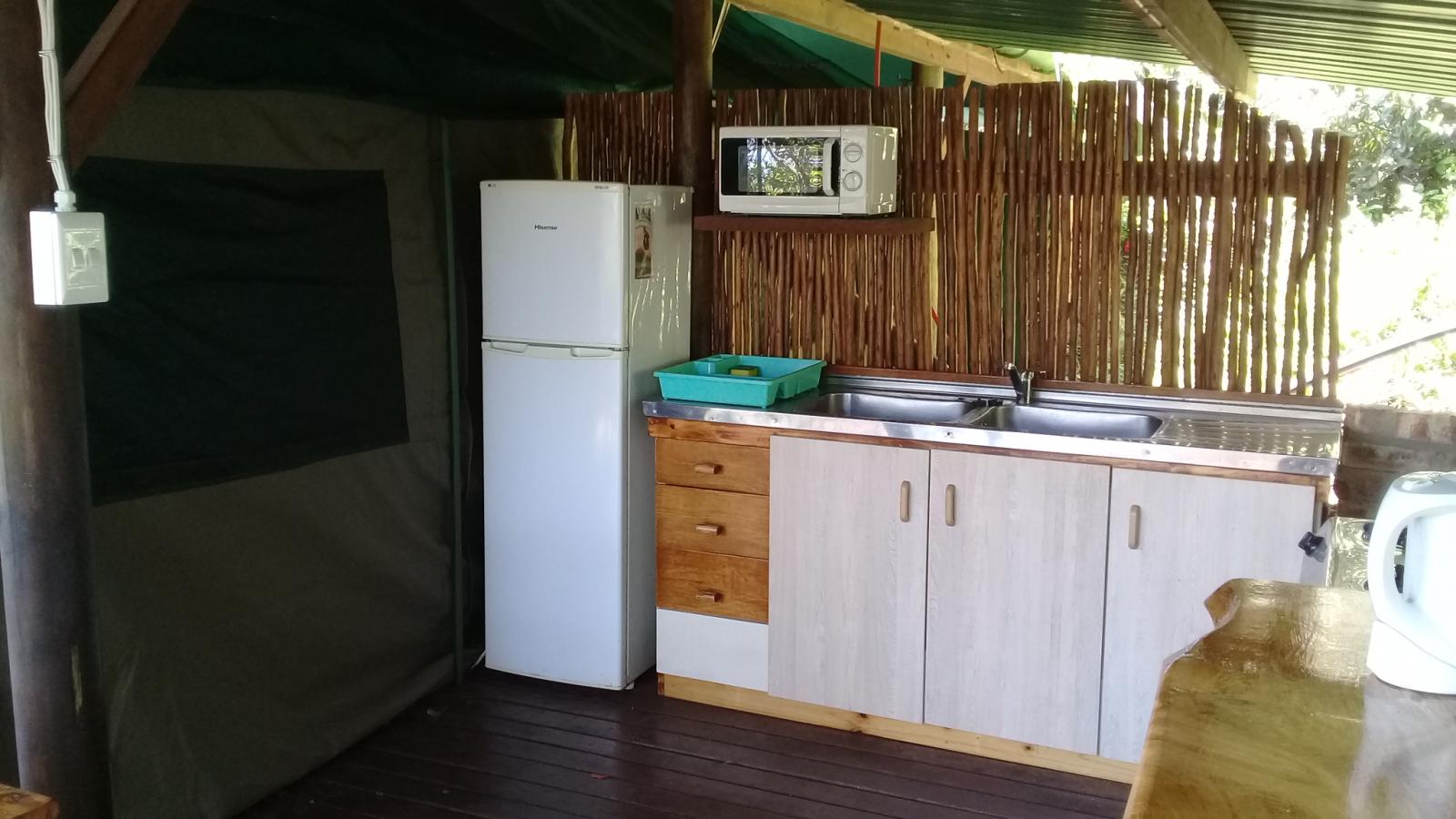 Experience tranquility and privacy in nature on the Garden Route. A nature lover's retreat with birds and bushbuck coming down to the waters edge to drink. Nestled in amongst the milkwood trees the bushtent sleeps a maximum of 4 people, and comprises of a main room with a double bed and a smaller room with 2 single beds. It has adjoining toilet and shower facilities and a fully equipped kitchen. An outside braai /barbeque area on the deck is also right next to the kitchen.