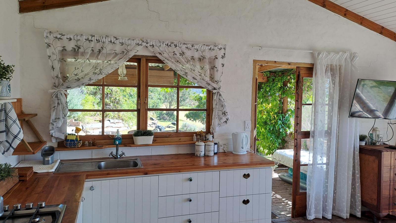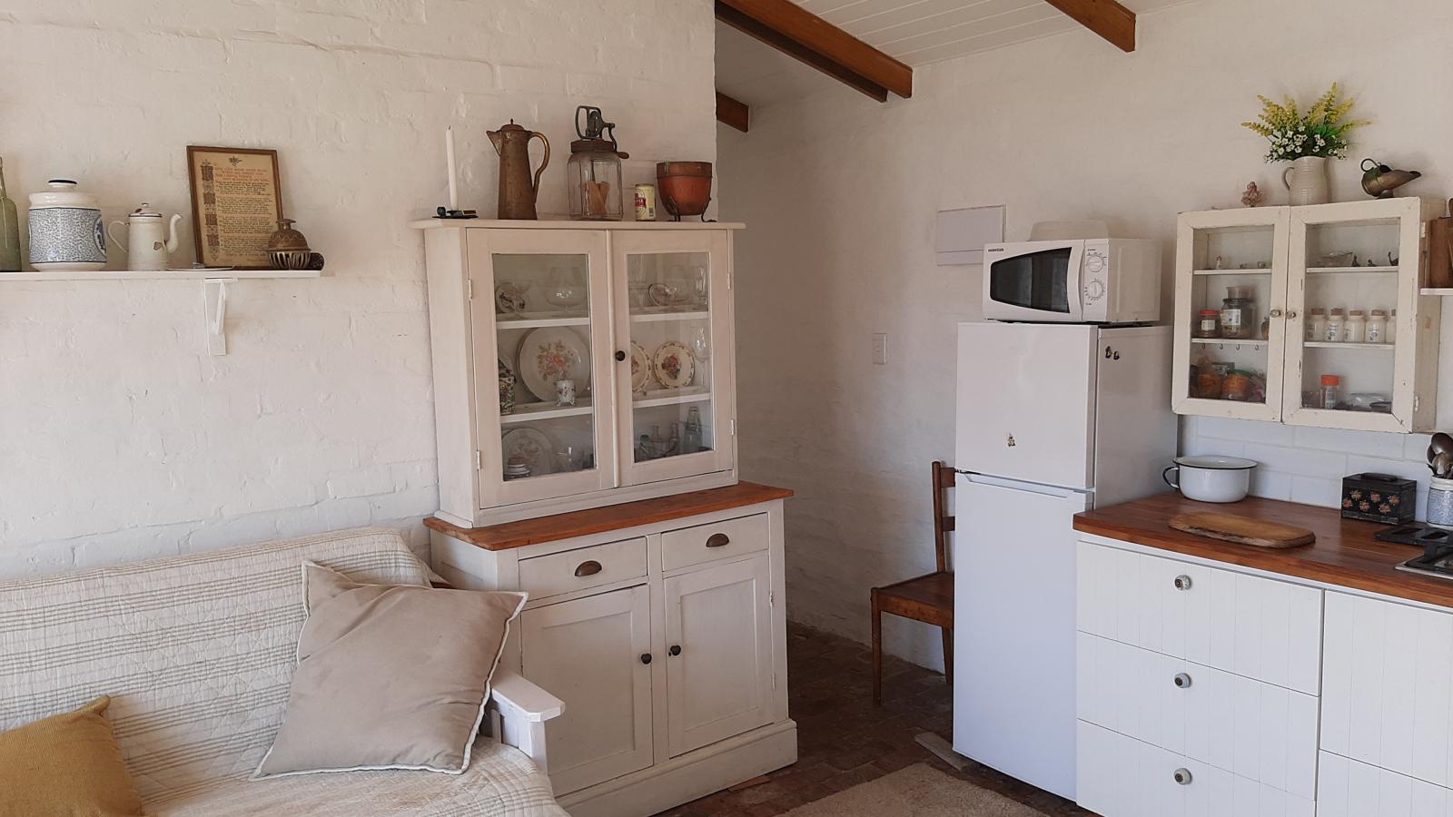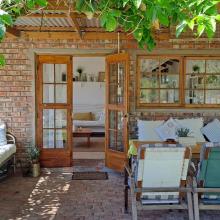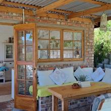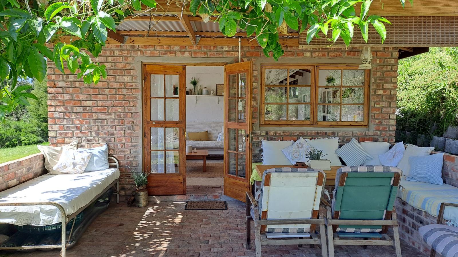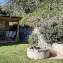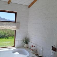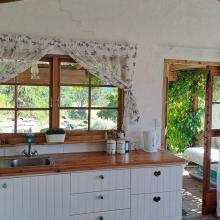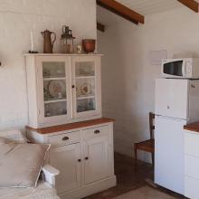 It sleeps 5 people comfortably, has one bathroom with shower and bath, a fully outfitted kitchen with gas stove, microwave and fridge. It also has a lovely outside stoepe and braai area.